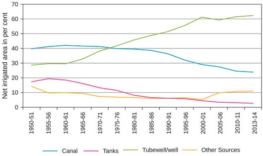 “Surface water irrigation (canal and tank) accounted for 57 per cent of total net area irrigated in 1950–51, but declined to 27 per cent in 2013–14. In the same period, the share of groundwater irrigation in the total net area irrigated increased rapidly, from 28.7 per cent in 1950 to 62.3 per cent in 2013”