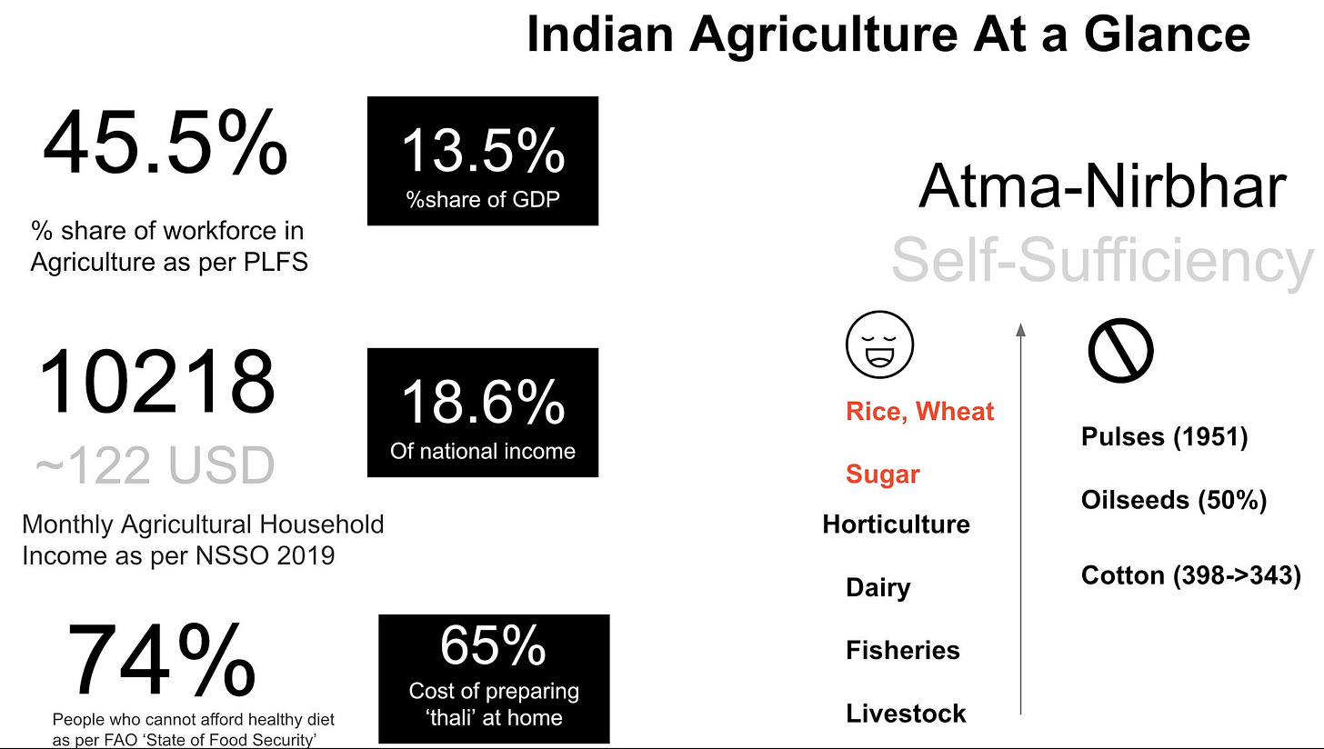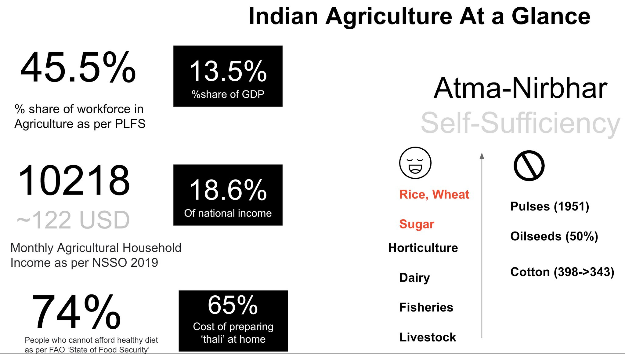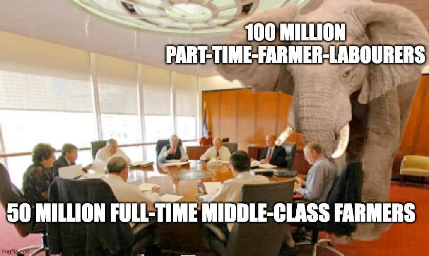 This naturally creates a labour productivity imbalance in a country where there are more agricultural labourers (~100 Mn) than farmers (~50 Mn full-time ‘middle-class farmers’) who derive their income solely from farming operations.