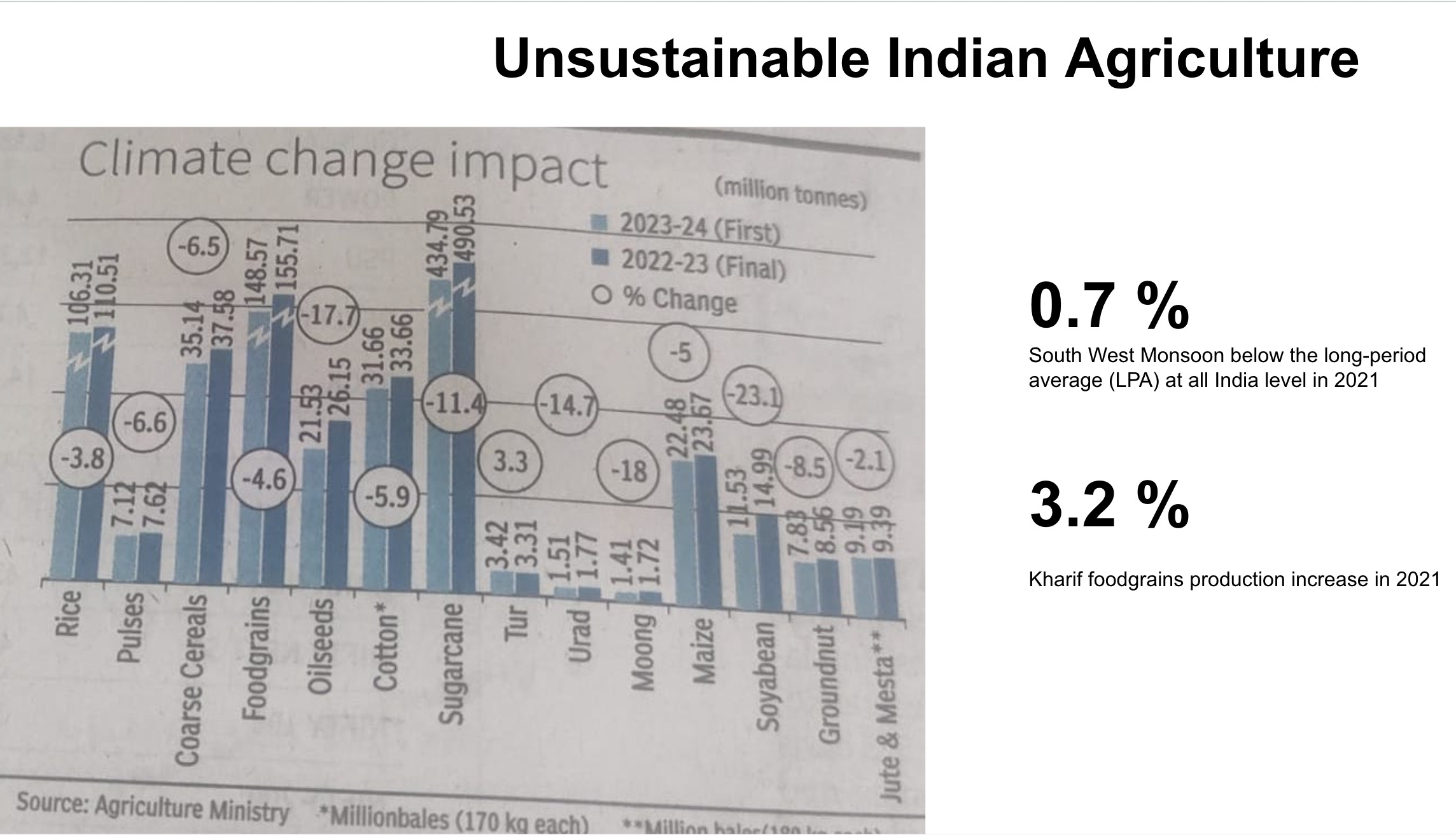 In 2021, when South West Monsoon ‘was 0.7 per cent below the long-period average (LPA) at all India level, kharif foodgrains production increased by 3.2 per cent during the year’.