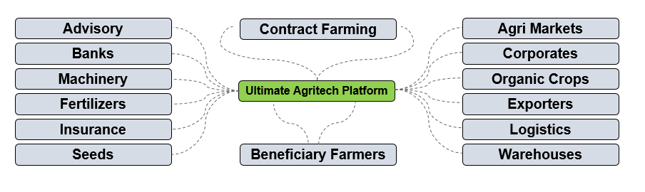 Here is one illustrative version (not a definitive one) of how this collaboration platform could marry different players from both ends. I had drawn this earlier for an article I published defining the Agritech platform stack. This article, btw, is more than two years old, and today, I would define agritech platform differently.