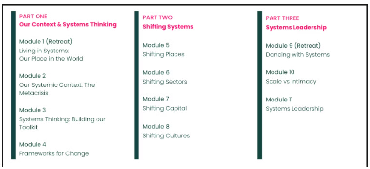 The retreat I am attending is a part of the Mastery of Systems Leadership Fellowship I am undertaking from September’25 to May’26 with a fortnightly six hour learning cadence. The course structure looks something like this.