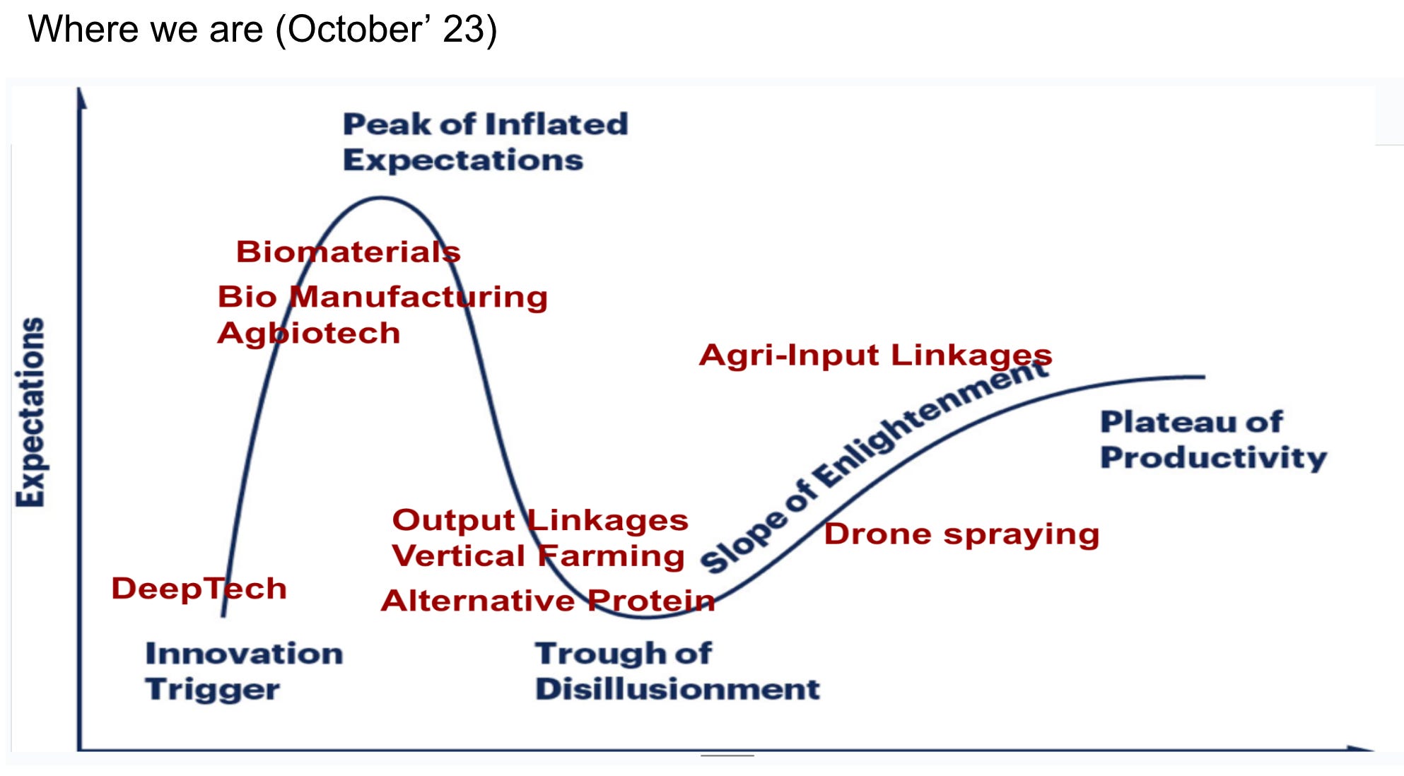 Exactly a year ago, in Oct’22, when I did a detailed reality check on the Agritech Hype Cycle, I sketched this Gartner hype curve and elaborated my thoughts.
