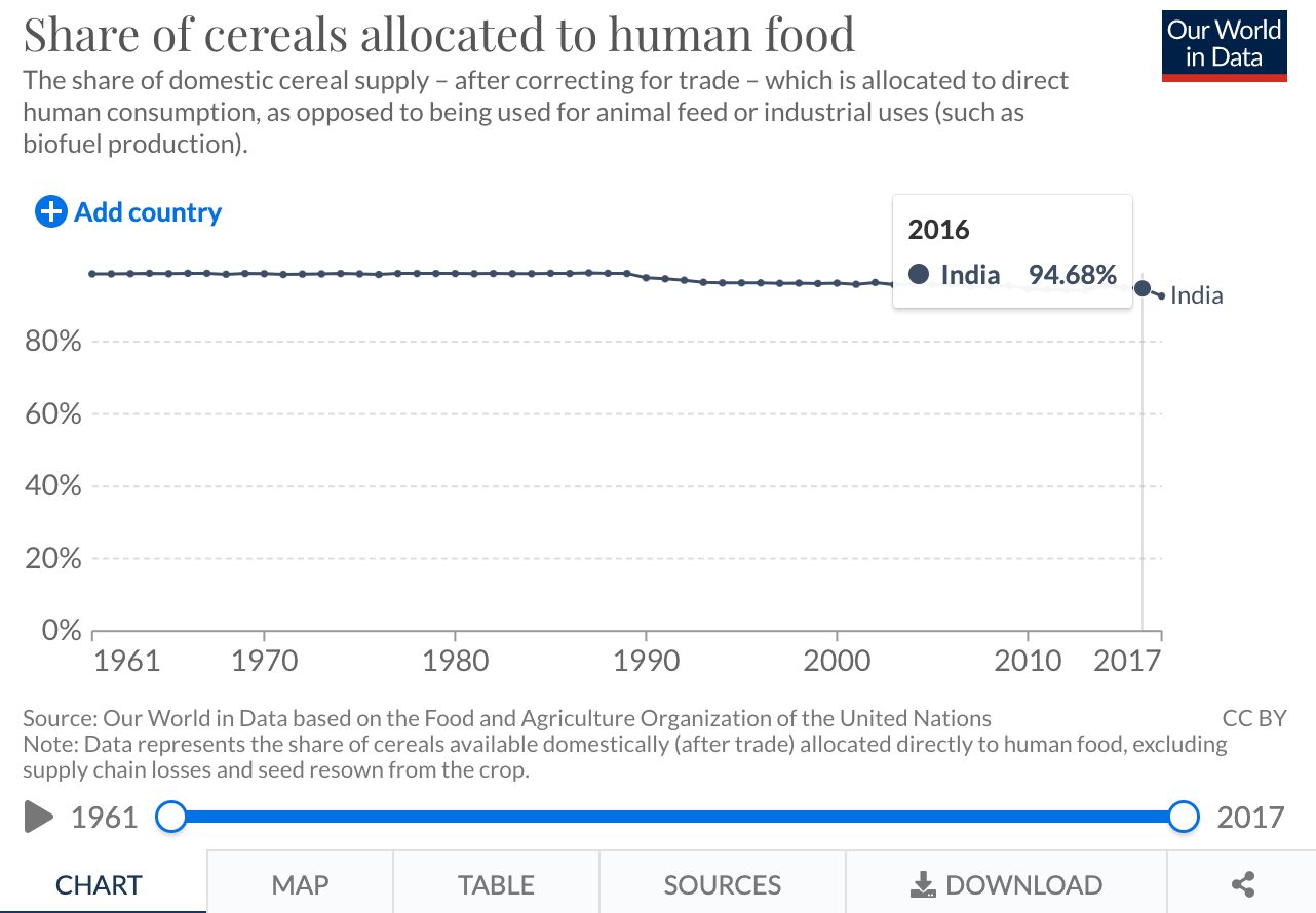 e. When you study the number of cereal crops allocated directly to human food; used as animal feed, and allocated to other uses (predominantly industrial uses such as biofuel production), India stands tall at 93% ( 2017)