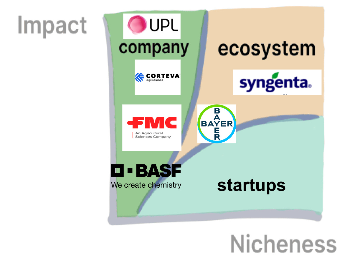 And so, when I take into account who is attempting to build either a company platform or at the starting journey of building an industry-wide open innovation ecosystem, the big 6 agri input firm landscape looks like this.