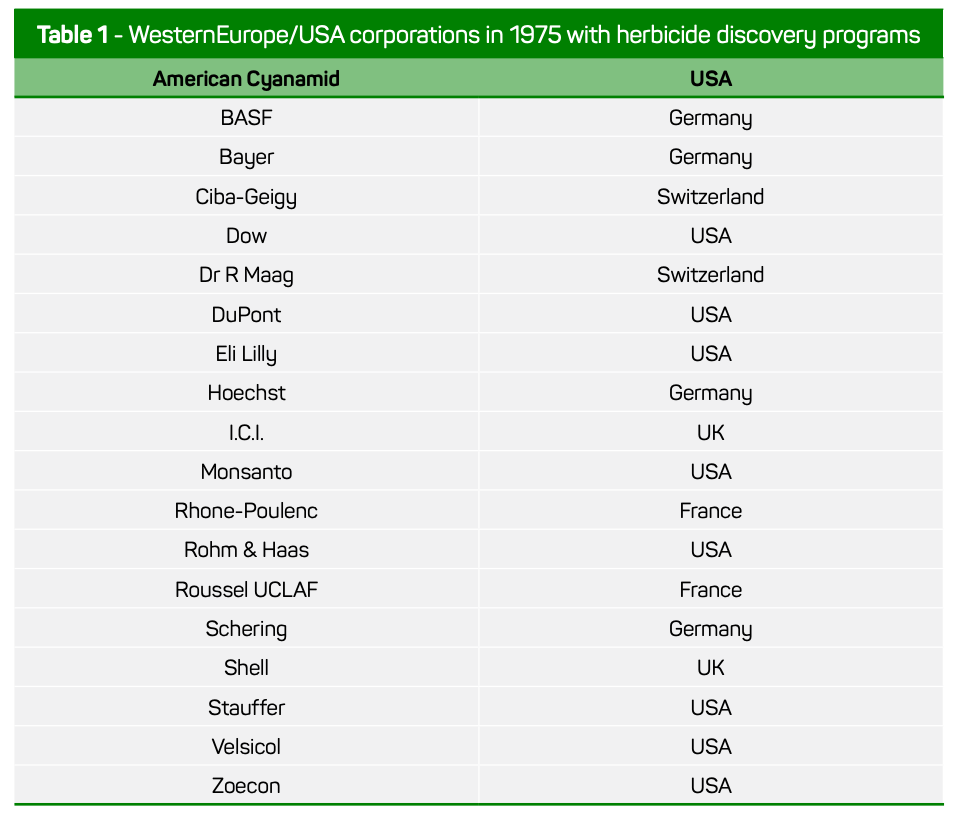 Among the papers published in the journal, Stephen Powle’s paper fascinated me the most, as it gave a fascinating historical perspective that explained why herbicide discovery program is currently run only by 5 Big Ag majors - BASF, Bayer, Corteva, FMC, Syngenta. The contrast becomes stark when you see how many corporations in USA/Europe had herbicide discovery programs.