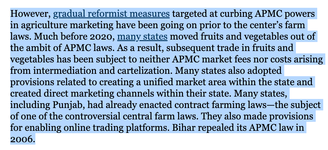 Anirudh makes an insightful point here that the steady reformist trajectory of agricultural markets has been in progress much before the farm laws.