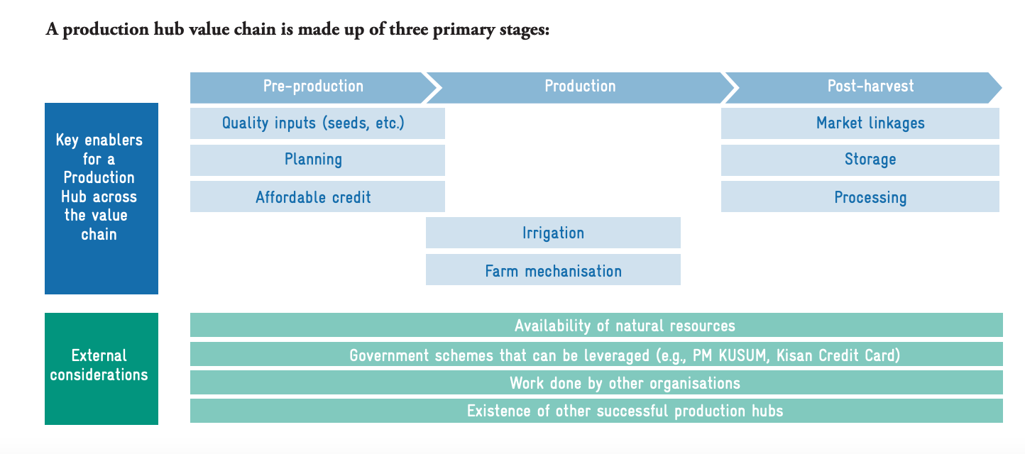 “A production hub may be defined as a contiguous cluster of villages where actors in and around it enable an ecosystem for continuity of farm production (agriculture and livestock) and associated marketing. A production hub can be catered to by a combination of processes to ensure production of high-value crops and market access for farmers of crops and livestock.”