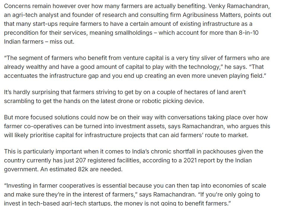 How is the Indian Agritech landscape evolving, after the last year's funding winter? Is the investment going towards the right places? I shared my 2 cents on this piece by Harry Holmes.