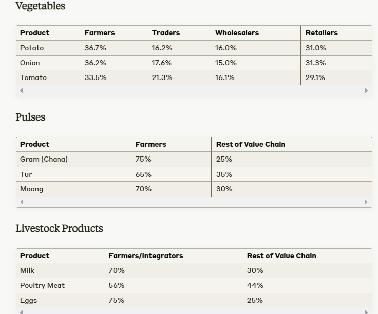 In the pulses category, farmers receive a significantly larger share of the final price, with gram (chana) providing the highest return at 75%.