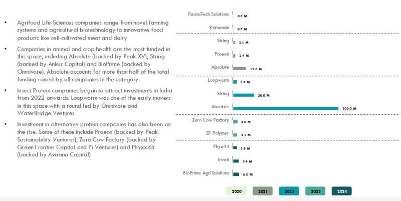 💡Biopharma and medical biotech, once dominant (61% of 2020 funding), declined to 18% by 2024. Funding has shifted toward sustainable materials, agrifood life sciences, and industrial biotech, growing from USD 11.5M in 2020 to USD 174M in 2024.