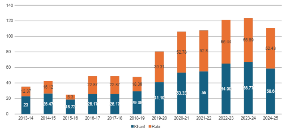 → Rice paddies are significant sources of greenhouse gas emissions. According to data from the Ministry of Environment, Forest, and Climate Change (MoEFCC), carbon dioxide-equivalent emissions from paddy fields are approximately 5.65 kilograms per kilogram of rice produced. Annually, emissions per acre can range from nearly 6 to 13 tons of CO2-equivalent, making rice cultivation a considerable contributor to agricultural emissions and climate change impacts (MoEFCC, 2021)