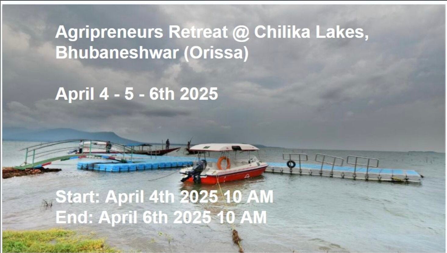 After the success of the three Agri-founders' retreats in West - Nashik(Jan 2024), South -Bangalore (May 2024) and North -Jaipur (Aug 2024), we are hosting our fourth retreat for 50 Agripreneurs/Agritech founders on April 4-5-6 in Chilika Lake, 115 km from Bhubaneshwar Airport.