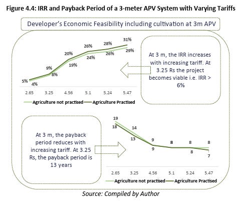 “ Our analysis finds APV to be economically feasible for developers with payback periods ranging from 13 years (at a tariff of 3.25 INR/kWh) to as low as 9 years (at a tariff of 4.56 INR/kWh), where tariff of the PMKUSUM Component A in Rajasthan that has the highest installation under the scheme is found to be 3.25 Rs/kWh and the Average Power Purchase Cost (APPC) of thermal power in India “