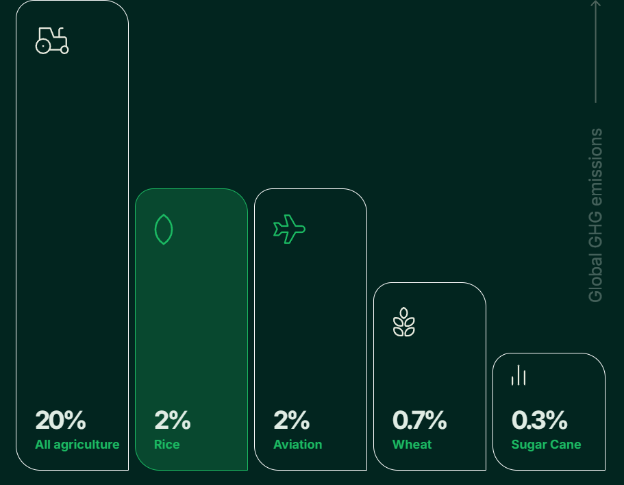 “Methane and nitrous oxide emissions from rice farms could have the same long-term warming impact as about 600 coal plants (1,900 MMT per year CO2e100) (Source)”
