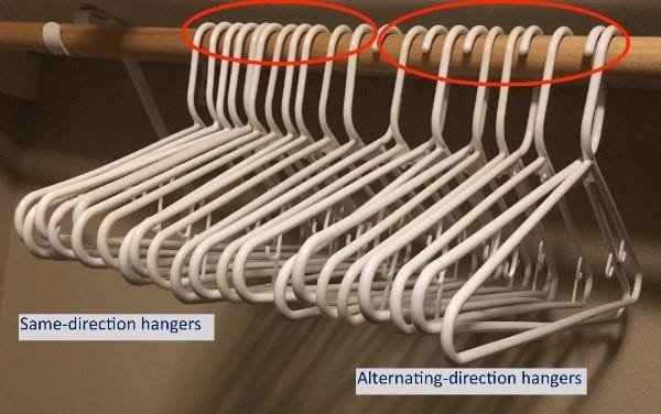 And one day, as the urban legend about this crime goes, the gang was caught when one store, at the suggestion of a cop, arranged its clothes with alternate hangers facing opposite directions (see the photograph below). This messed up the racking and the gang's modus operandi and slowed down the thieves by forcing them to remove one hanger at a time.