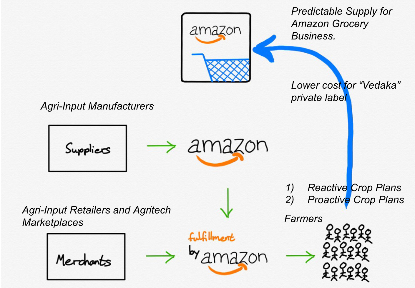 d) Amazon launching Kisan (Farmer) Store and agronomy services in India to build the necessary data flywheel that would power their food and groceries low-cost, high-margin private label operations.