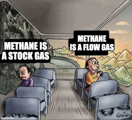 If you go by current standards, one molecule of methane is as strong as 28 molecules of carbon dioxide. And at the same time, biogenic methane emissions (flow gases) are part of the carbon cycle. When cattle emit methane, it may very well be a net sequestering or net emitting cycle, depending on management, inputs, feed, and a whole variety of parameters.