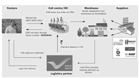 Before building their own fulfilment network and AgroEx platform for delivery tracking, their original transaction cycle looked like this, with the farmer making a missed call, followed by a call back from a sales executive who takes down the order. Fulfilment happens through the central warehouse and payment collection through India Post.