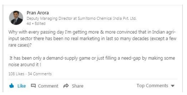 Which brings us to this question: Why have the Go-to-Market approaches in the Indian agri-input industry been static over the last five decades? Some time back, Pran Arora, an Industry veteran in the Agrochemical industry had made a similar statement to this effect. He said,