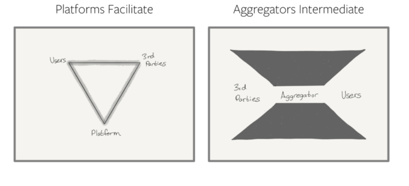Platforms are powerful because they facilitate a relationship between 3rd-party suppliers and end users; Aggregators, on the other hand, intermediate and control it.